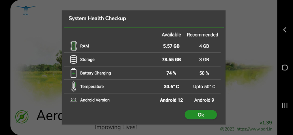 Every time AeroGCS GREEN is launched on a device, the application automatically performs a System Health Checkup to verify that the device meets the recommended operating conditions for optimal stability and safety.