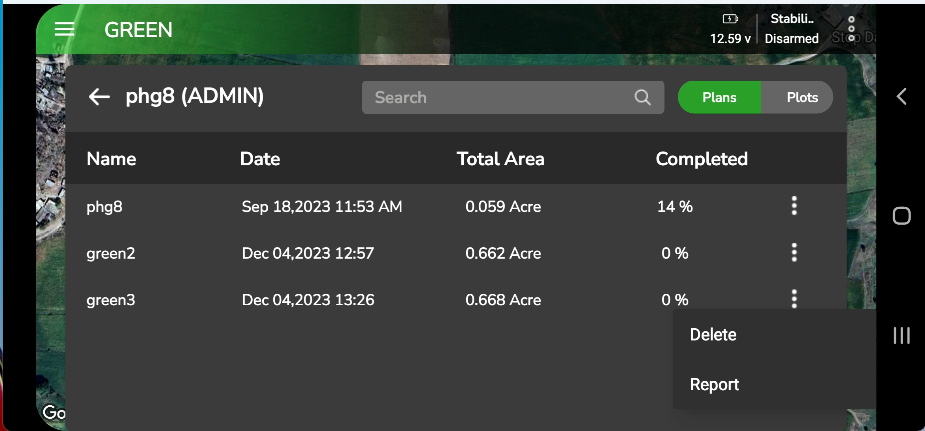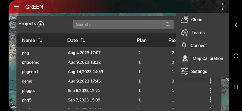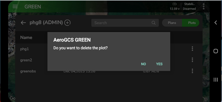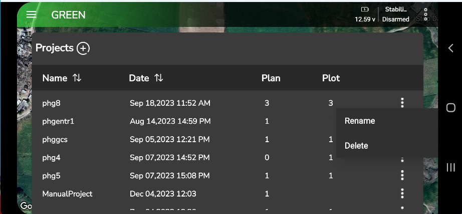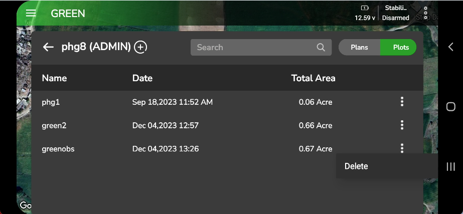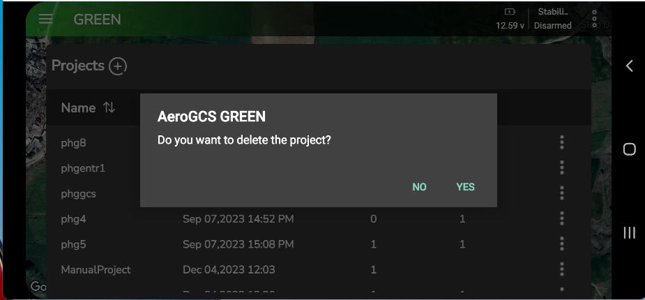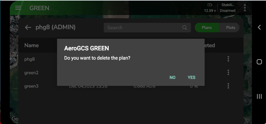 If you are not logged in to AeroGCS Enterprise from within AeroGCS GREEN, you can delete projects, plans, and plots directly in the app. Deleting a project will permanently remove all associated plans and plots.