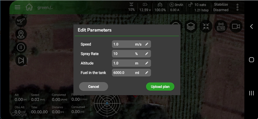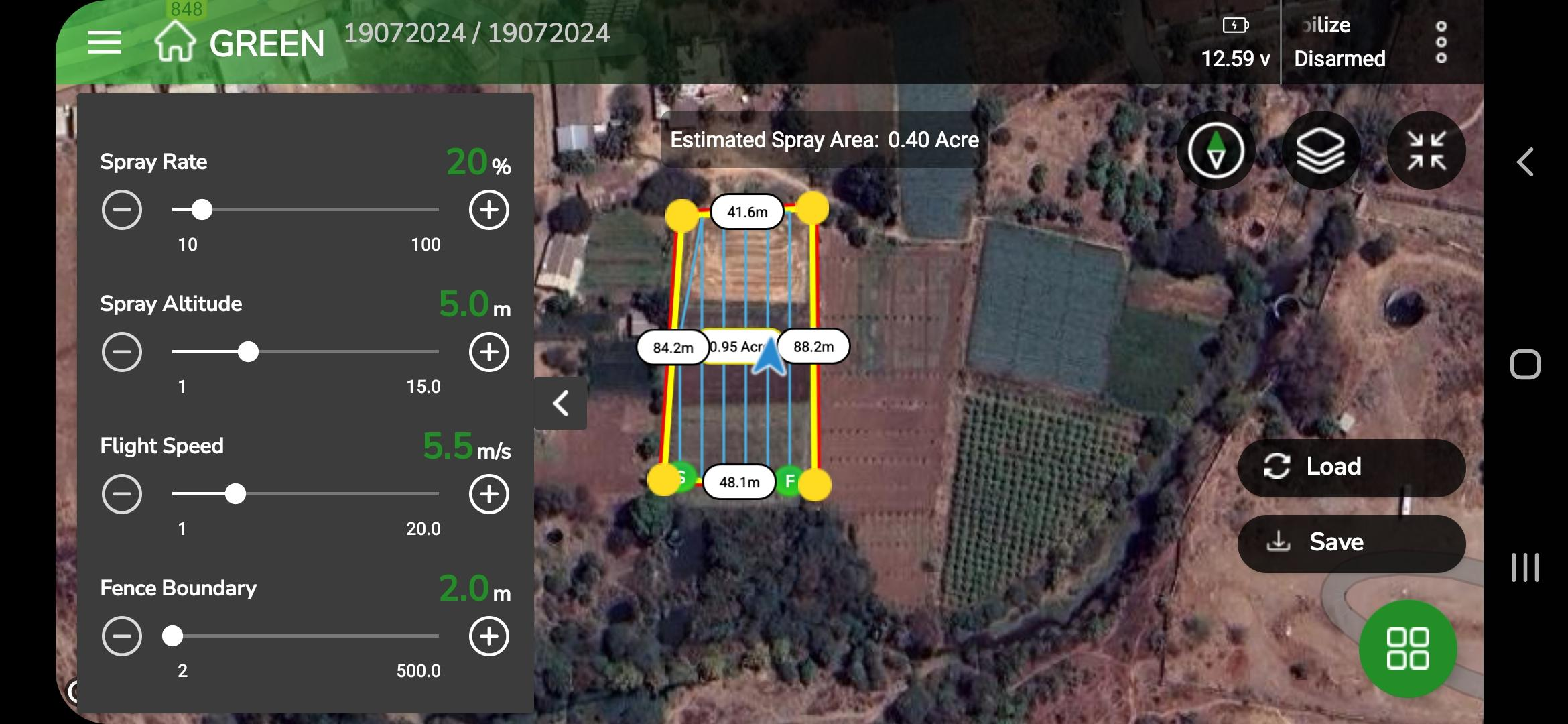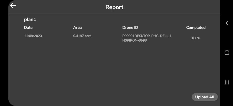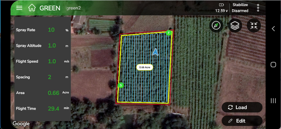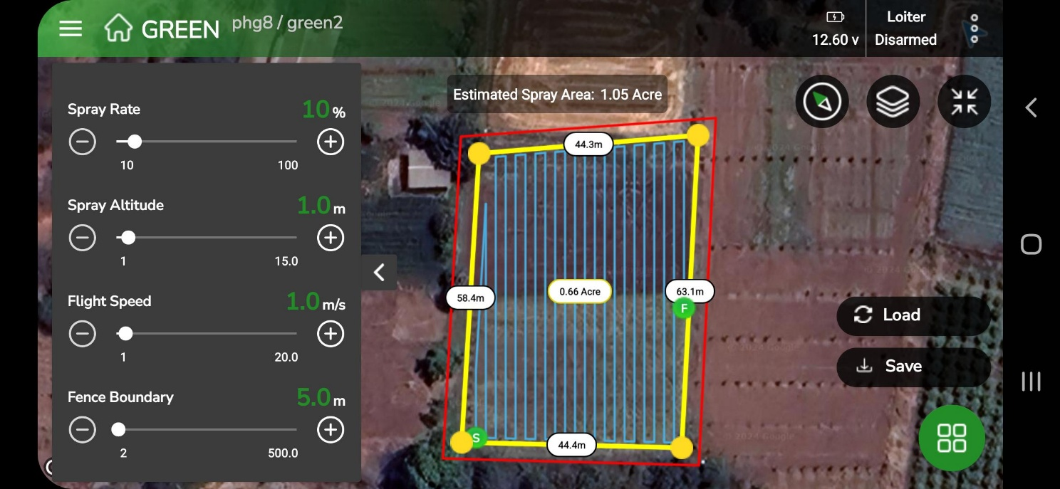 After making all necessary adjustments, save your changes and tap Load to initiate the flight. Observe the flight with the updated parameters, complete the mission, and generate a report. Any recent changes made to the plan or plot will be saved and displayed in the list for your reference.