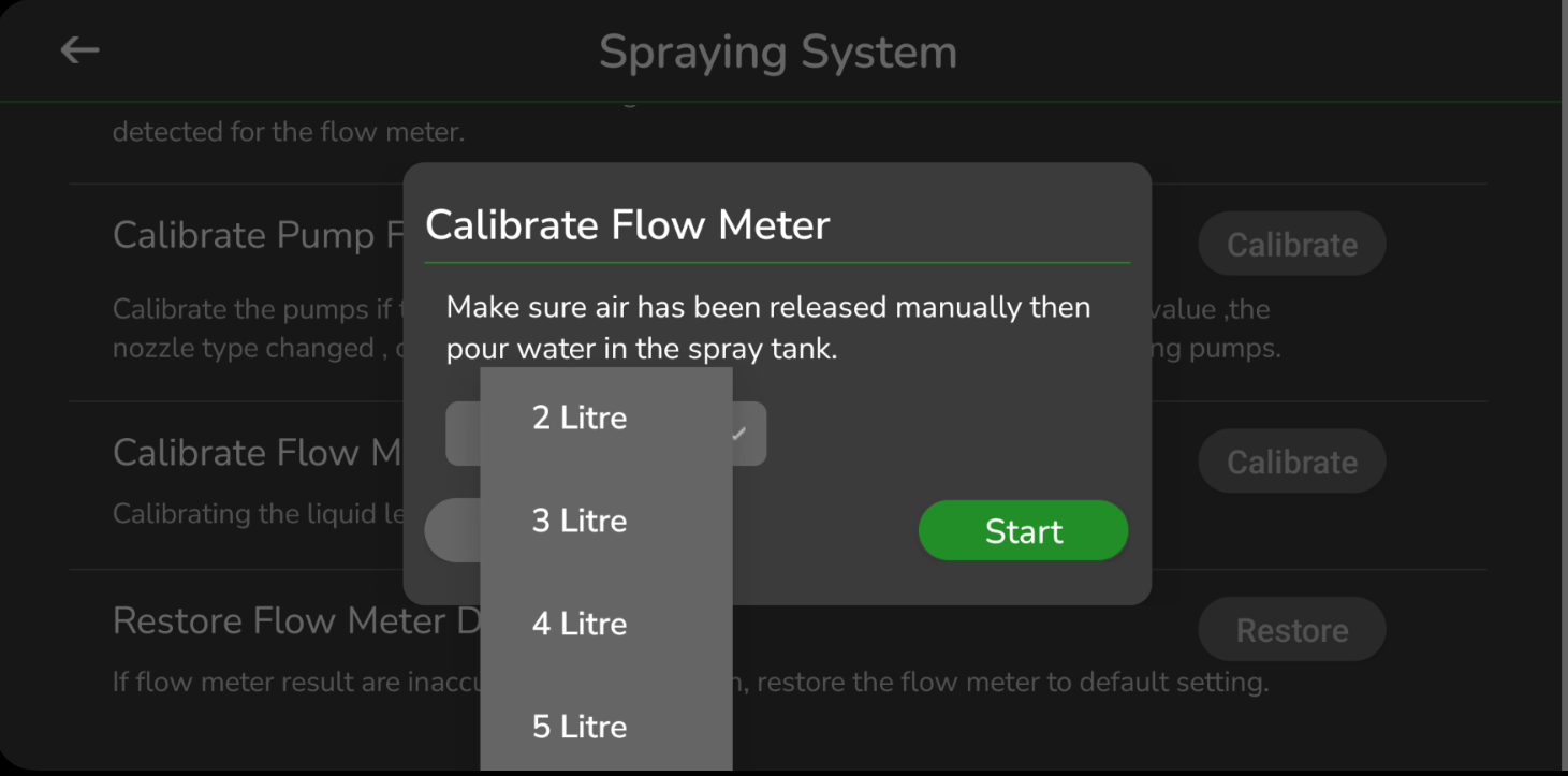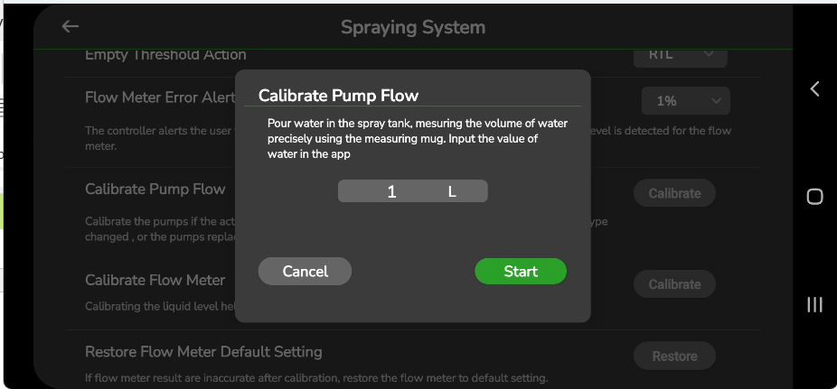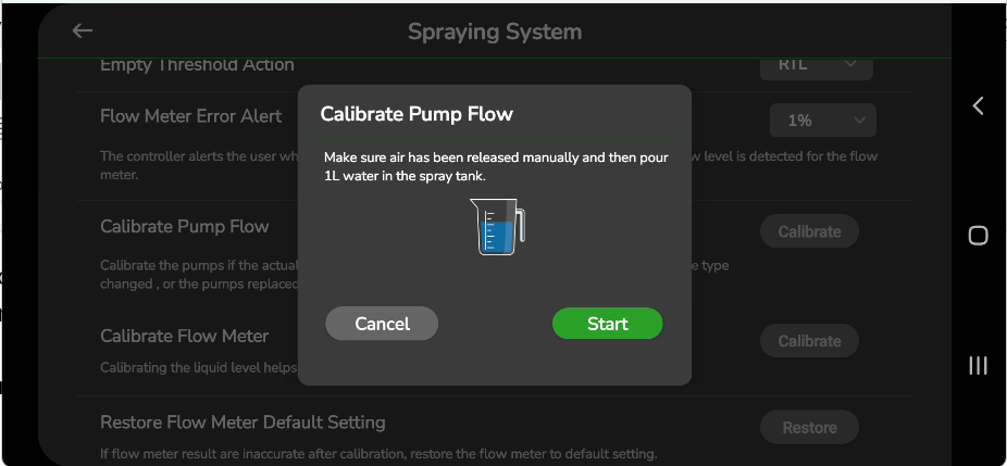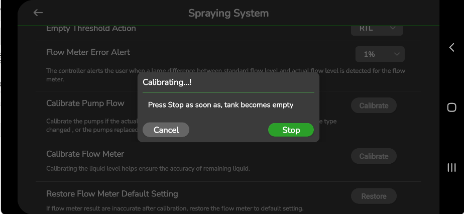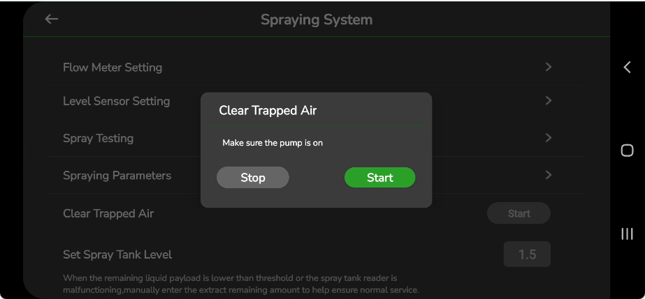 The Spray Testing feature lets you test the spraying speed before an actual flight. Tap Spray Testing on the Spraying System screen. The following screen will appear: