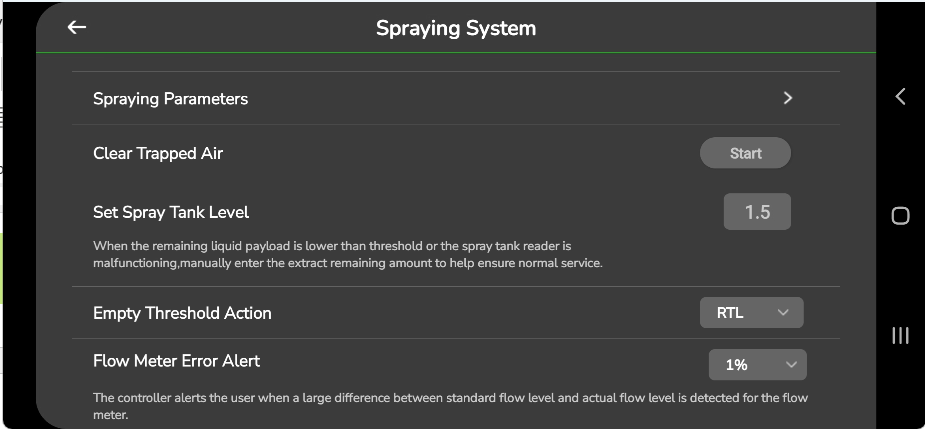 The Spraying System settings allow you to configure parameters related to the pump, tank, and spraying operations. These settings appear as shown below: