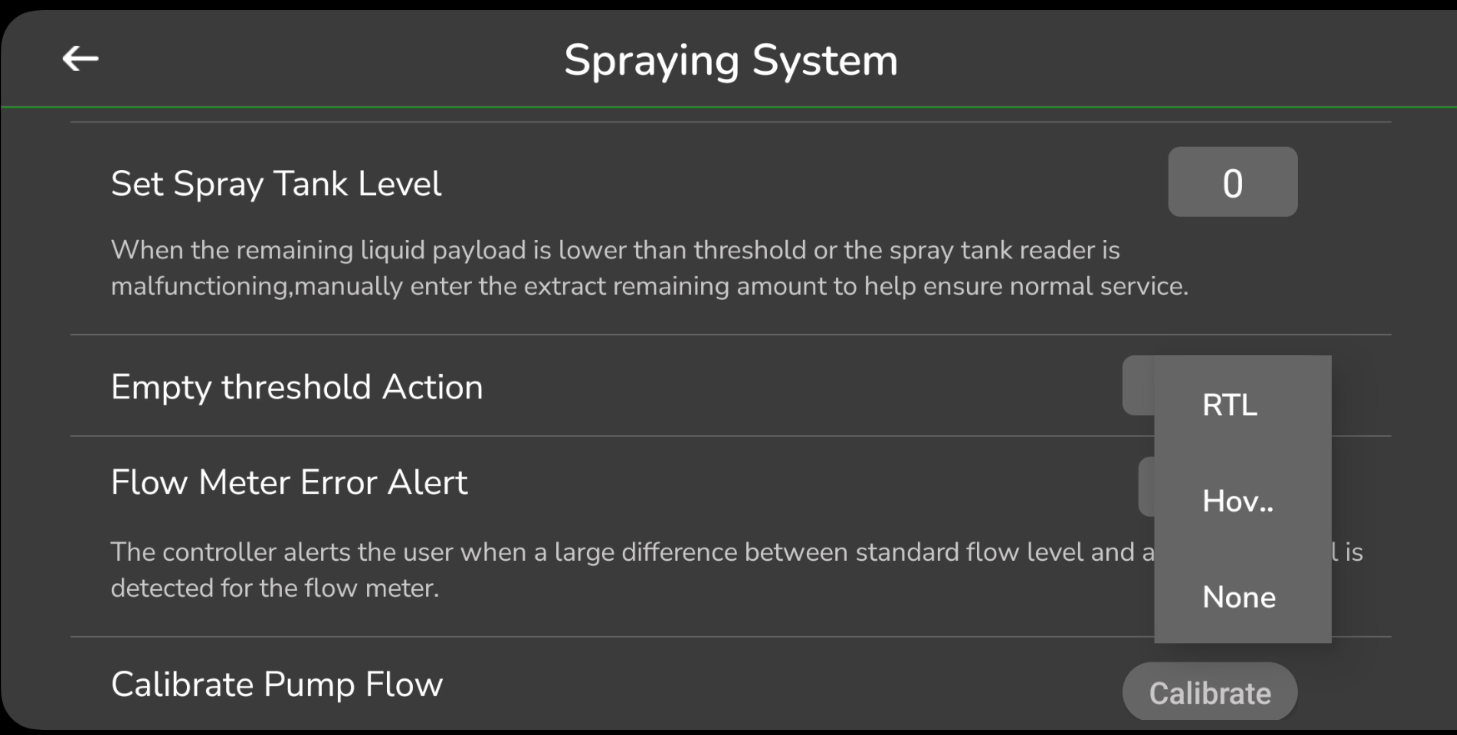 - RTL (Return to Launch): If this option is selected, the drone will return to the launch point after finishing the spraying.