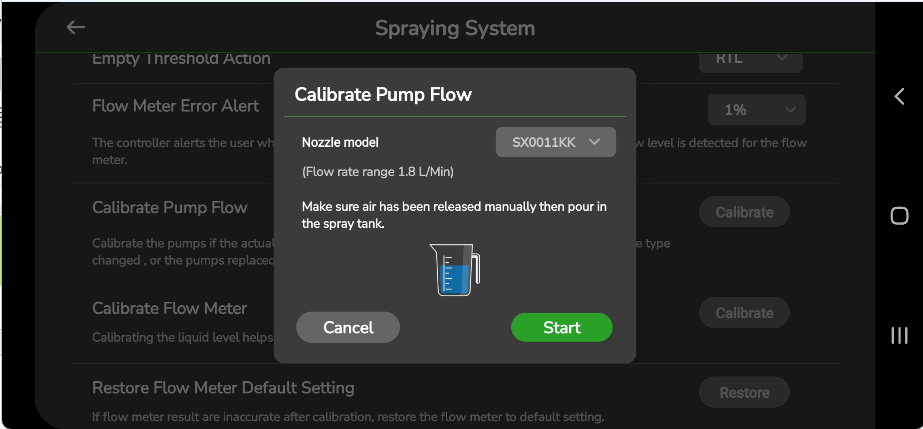Perform pump calibration if you notice irregular spraying, change the nozzle model, or replace the pump.