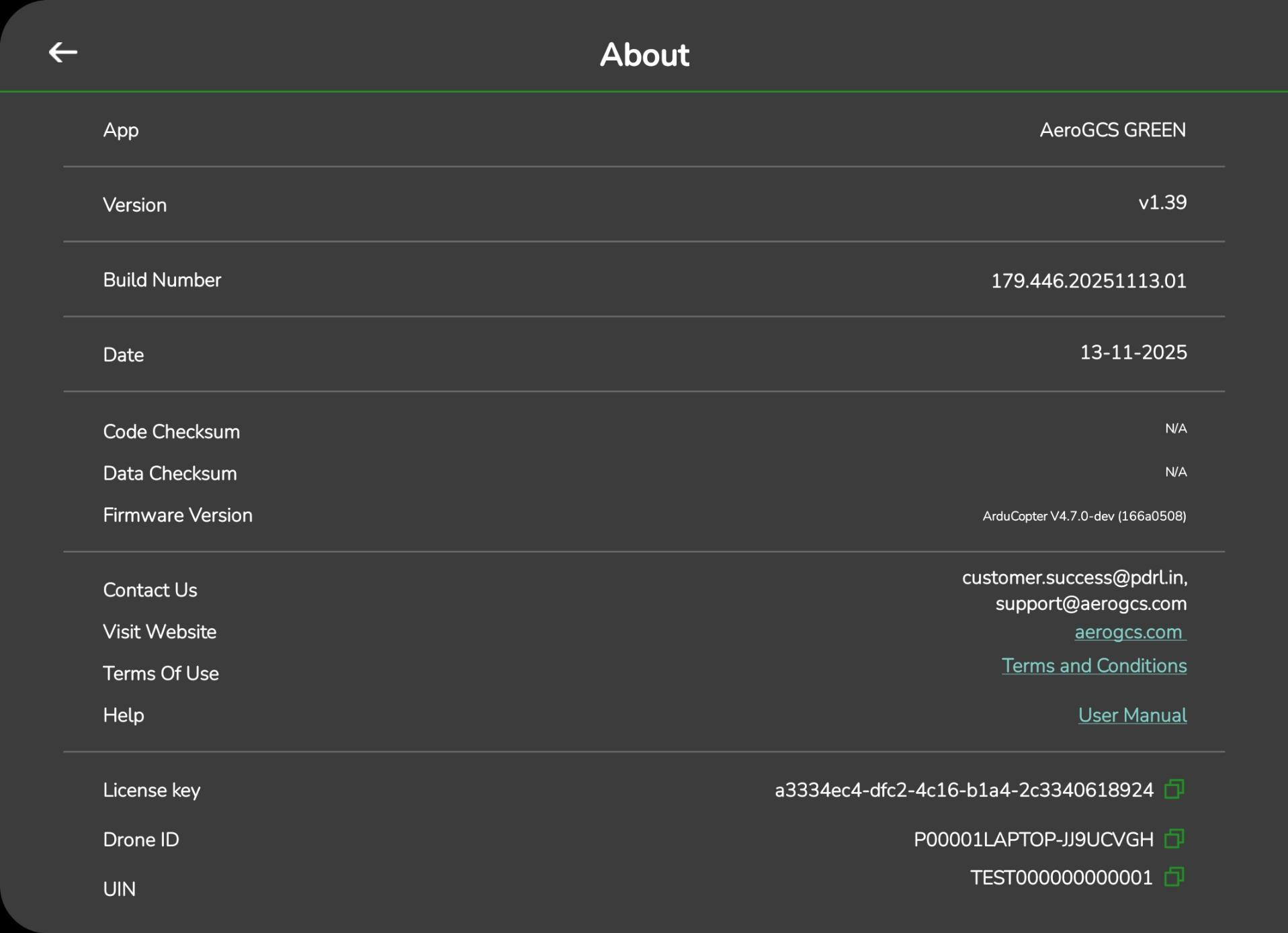 You can use this screen to verify the app version, build number, firmware version, and key identifiers such as License Key, Drone ID, and UIN.