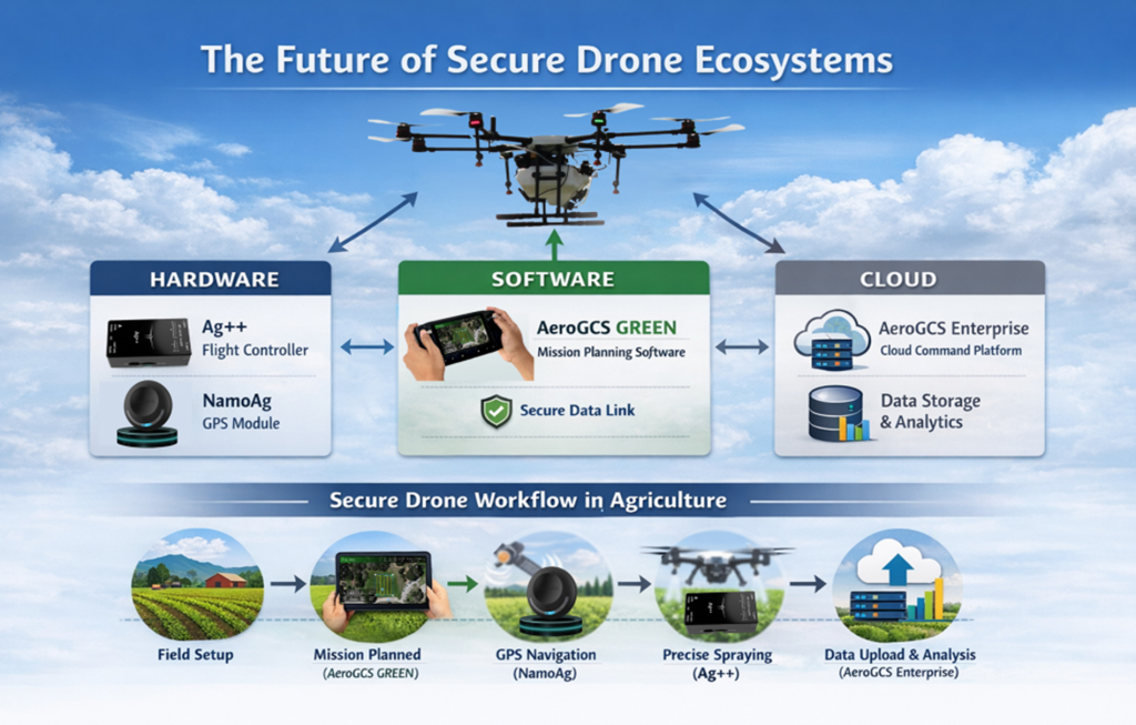 How secure flight controllers, GPS systems, mission planning software, and cloud platforms are quietly shaping the next decade of agricultural drones.